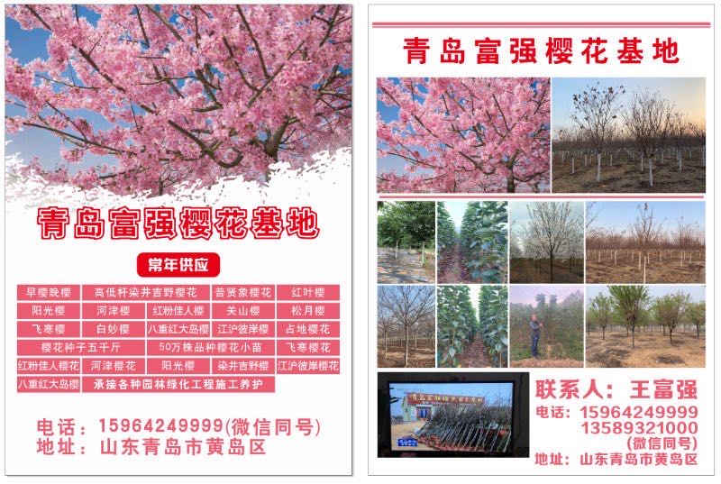 山東青島富強櫻花苗木基地歡迎您(王富強 13780680000、13589321000),青島富強品種櫻花基地常年供應(yīng):早櫻晚櫻,高低桿染井吉野櫻花,陽光櫻,河津櫻,紅粉佳人櫻,關(guān)山櫻,大漁櫻,松月櫻,飛寒櫻,白妙櫻,美利堅櫻,紅花染井吉野櫻,八重紅大島櫻,江滬彼岸櫻,小松乙女櫻,思川櫻,紅山櫻,雅櫻,獎?wù)聶眩酥丶t垂枝櫻等占地櫻花,承接各種園林綠化工程施工養(yǎng)護。歡迎新老客戶來我們這邊考察,購苗買苗服務(wù)。